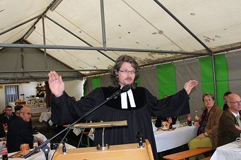 Am 18. Oktober 2014 fand nun in einem feierlichen Rahmen die offizielle Einweihung des herausgeputzten Fahrzeuges statt. Zu den Gästen zählten der Bürgermeister Hans-Jürgen Kropf, der stellvertretende Landrat Hans-Peter Baumann, Kreisbrandinspektor Thomas Reuther, Kreisbrandmeister Philipp Kemnitzer, Pfarrer Holger Winkler, eine Abordnung unserer Freunde von der Feuerwehr Truchtlaching sowie Vertreter der Nachbarwehren und der örtlichen Vereine. Bürgermeister Hans-Jürgen Kropf lobte unsere "hervorragende Jugendarbeit" und unser "kulturelles und gesellschaftliches Engagement" und auch der stellvertretende Landrat Hans-Peter Baumann zeigt sich begeistert: "Mehr als 30 Aktive bei 150 Einwohnern ist eine tolle Quote." Unser Vorstand Andreas Jakob berichtete, wie es zu dem Fahrzeugkauf kam: Das inzwischen 41 Jahre alte Vorgängerfahrzeug musste vor kurzem leider wegen größerer Mängel ausgemustert werden. Wir kauften es im Jahre 2001 von der Feuerwehr Truchtlaching und finanzierten dies damals selbst. Damals gingen wir davon aus, dass wir das Fahrzeug etwa 10 Jahre nutzen könnten. 13 Jahre konnten wir jetzt tatsächlich unsere Einsätze damit fahren. Im Juli 2014 stellte sich dann heraus, dass an dem Fahrzeug erhebliche Reparaturkosten anstanden, die wir nicht mehr finanzieren konnten. Niemand wusste, wie es nun mit unserer Wehr weitergehen würde. Groß war die Freude, als die Gemeinderäte ein Budget von 10.000 Euro für die Anschaffung eines gebrauchten Fahrzeuges zur Verfügung stellten. Kommandant Klaus Lehmann bedankte sich für die "schnelle, unbürokratische und zukunftsorientierte Entscheidung zum Wohle der Bürger". Für 9.200 Euro wurde im August dann ein entsprechendes Feuerwehrauto in Köln gekauft. Den Erlös für das ausrangierte alte Fahrzeug in Höhe von 600 Euro übergaben wir als Spende an die Gemeinde. Mit Sach- und Geldspenden von Unternehmern und eigenem Einsatz wurde der Mercedes Benz 814 F, Kilometerstand 39.000, Baujahr 1989, Sechs-Zylinder-Diesel-Motor mit 140 PS, mit neuem Zubehör wie zum Beispiel Notstromaggregat, LED-Lichtmasten, Tauchpumpe, Motorsäge, Kohlendioxyd-Feuerlöscher und Fahrzeugbeschriftung ausgestattet. Wochenlang wurde das Fahrzeug dann von uns technisch und optisch überholt bis es dann am 17.09.2014 sogar noch vor seiner offiziellen Einweihung zum ersten Einsatz bei einem Großbrand in Kirchgattendorf kam. Pfarrer Holger Winkler segnete alle Mitglieder der Feuerwehr Vierschau und bedankte sich für die Einladung. |